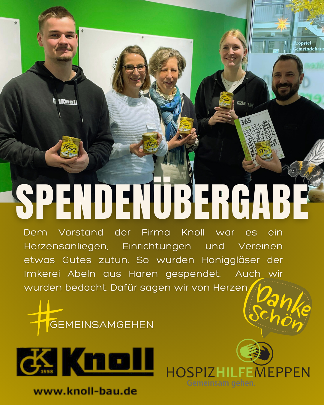 Dem Vorstand der Firma Knoll war es ein Herzensanliegen, Einrichtungen und Vereinen etwas Gutes zutun. So wurden Honiggläser der Imkerei Abeln aus Haren gespendet. Auch wir wurden bedacht. Dafür sagen wir von Herzen DANKE.