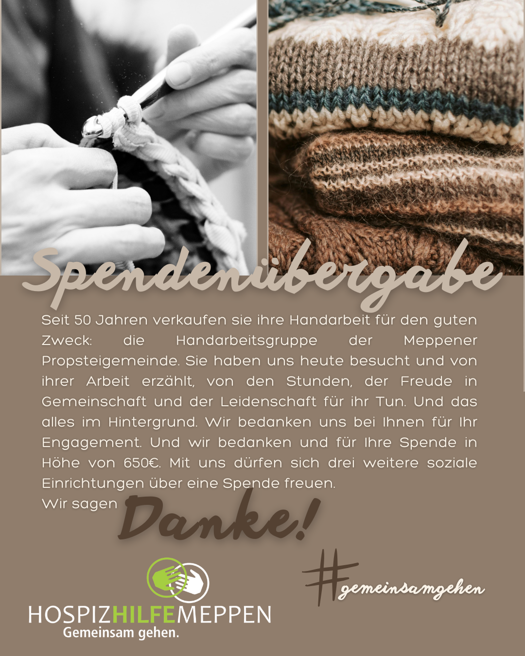 Seit 50 Jahren verkaufen sie ihre Handarbeit für den guten Zweck: die Handarbeitsgruppe der Meppener Propsteigemeinde. Sie haben uns heute besucht und von ihrer Arbeit erzählt, von den Stunden, der Freude in Gemeinschaft und der Leidenschaft für ihr Tun. Und das alles im Hintergrund. Wir bedanken uns bei Ihnen für Ihr Engagement. Und wir bedanken und für Ihre Spende in Höhe von 650€. Mit uns dürfen sich drei weitere soziale Einrichtungen über eine Spende freuen. Wir sagen DANKE!