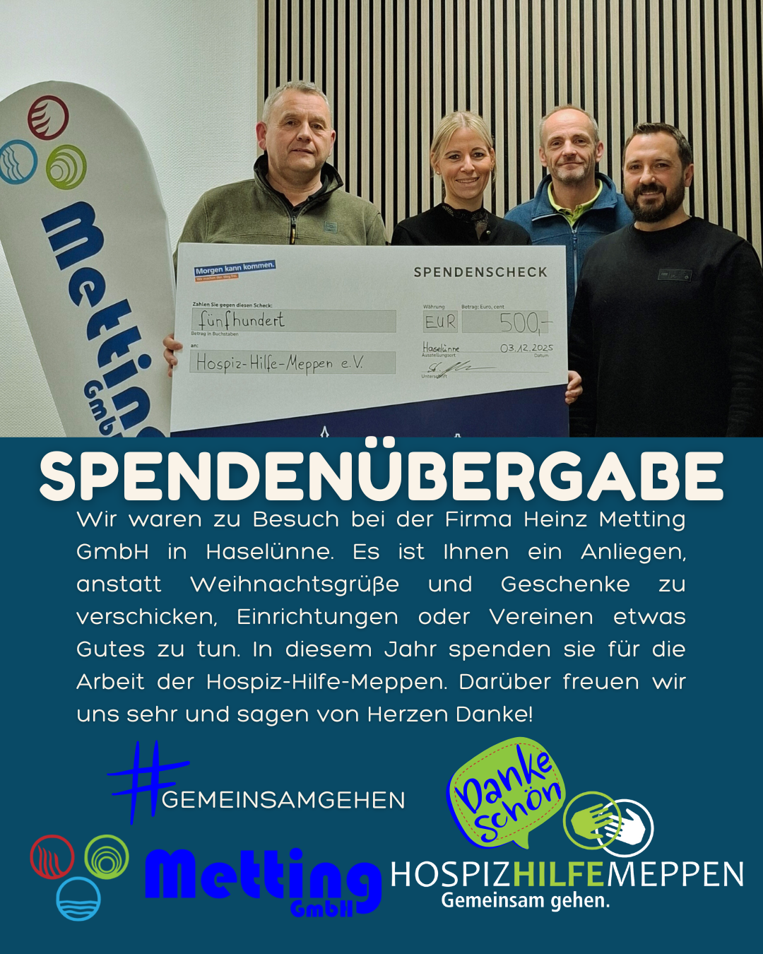 Wir waren zu Besuch bei der Firma Heinz Metting GmbH in Haselünne. Es ist Ihnen ein Anliegen, anstatt Weihnachtsgrüße und Geschenke zu verschicken, Einrichtungen oder Vereinen etwas Gutes zu tun. In diesem Jahr spenden sie für die Arbeit der Hospiz-Hilfe-Meppen. Darüber freuen wir uns sehr und sagen von Herzen Danke!
